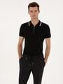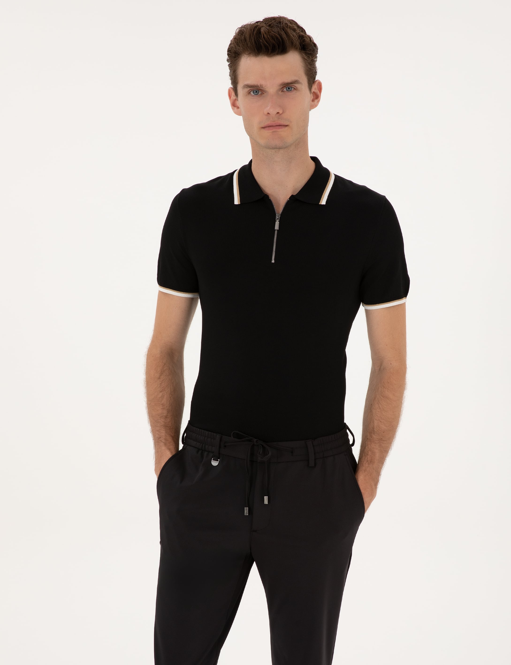 - Siyah Slim Fit Polo Yaka Fermuarlı Triko Kazak