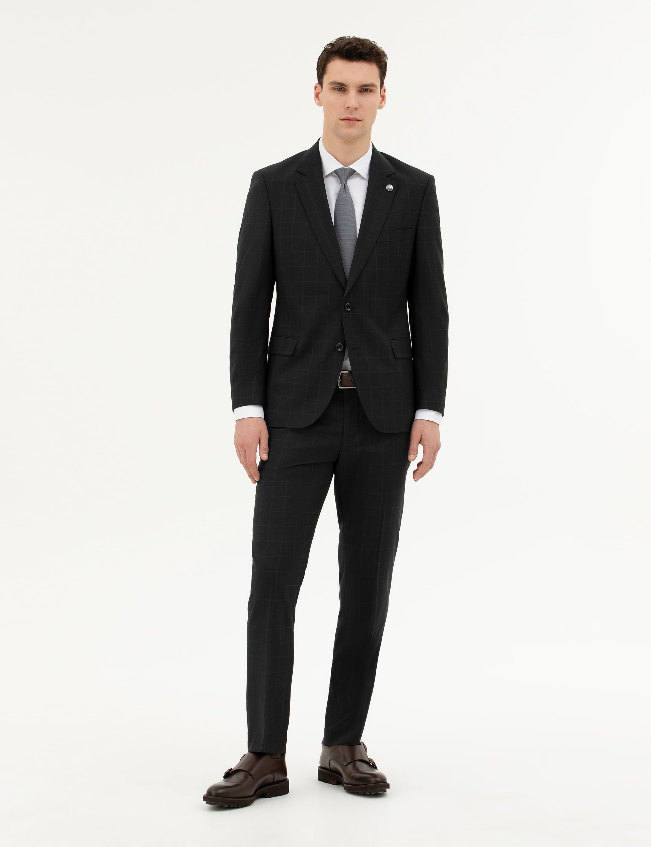 - Siyah Slim Fit %100 Yün Ekose Takım Elbise