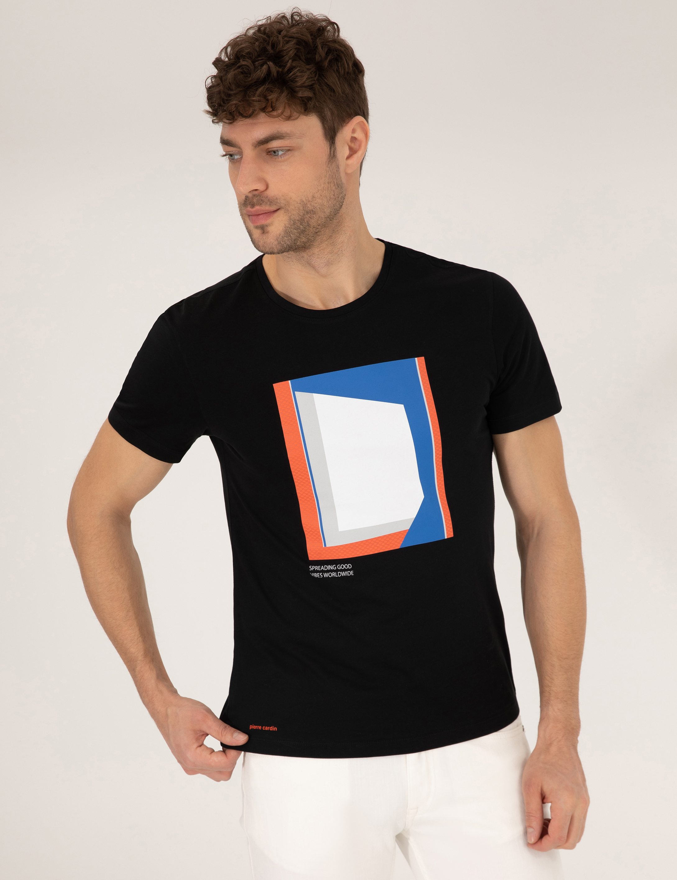 Siyah zemin üzerine özenle yerleştirilmiş modern baskı detayıyla öne çıkan bu erkek tişört, %100 pamuk kumaşı sayesinde nefes alabilirlik ve yumuşaklık sunar. Slim fit kesimi, vücudu nazikçe sararak sportif ve şık bir siluet yaratırken hareket özgürlüğünüzü kısıtlamadan rahat kullanım sağlar.