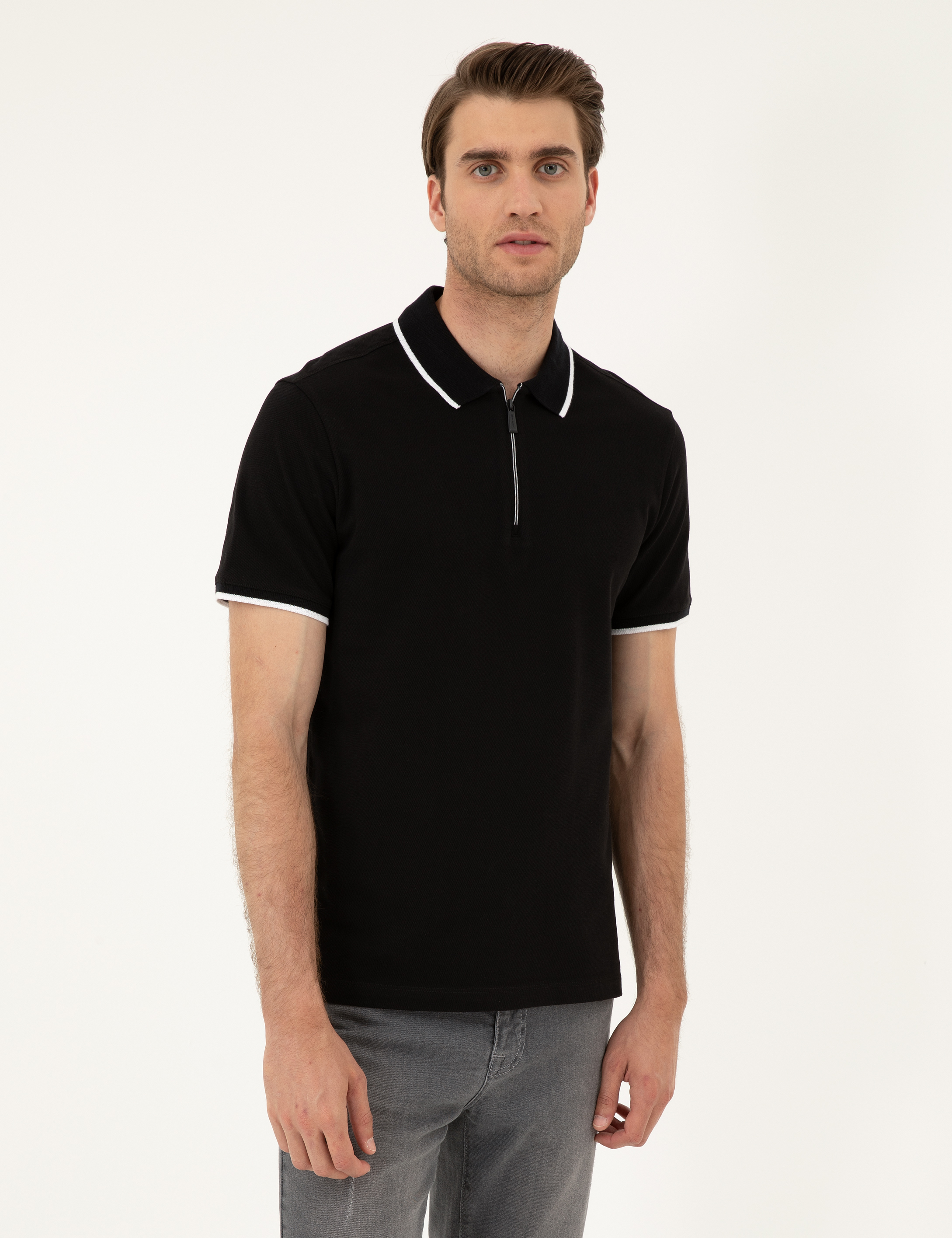 %100 pamuktan üretilmiş olan siyah polo yaka tişört, günün her anında hem şık hem de rahat hissetmenizi sağlayacak detaylarla öne çıkıyor. Fermuarlı yaka tasarımı klasik polo yaka anlayışına modern bir dokunuş katarken, ince beyaz şeritlerle süslenmiş kenarlar siyahın şıklığını vurgulayan bir uyum oluşturuyor. Günlük şıklığı sevenler için ideal olan tişört, düz deseni sayesinde her ortamda kolayca kombinlenebilir ve zamansız bir stil sunar.