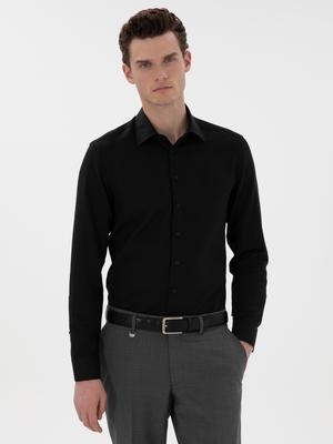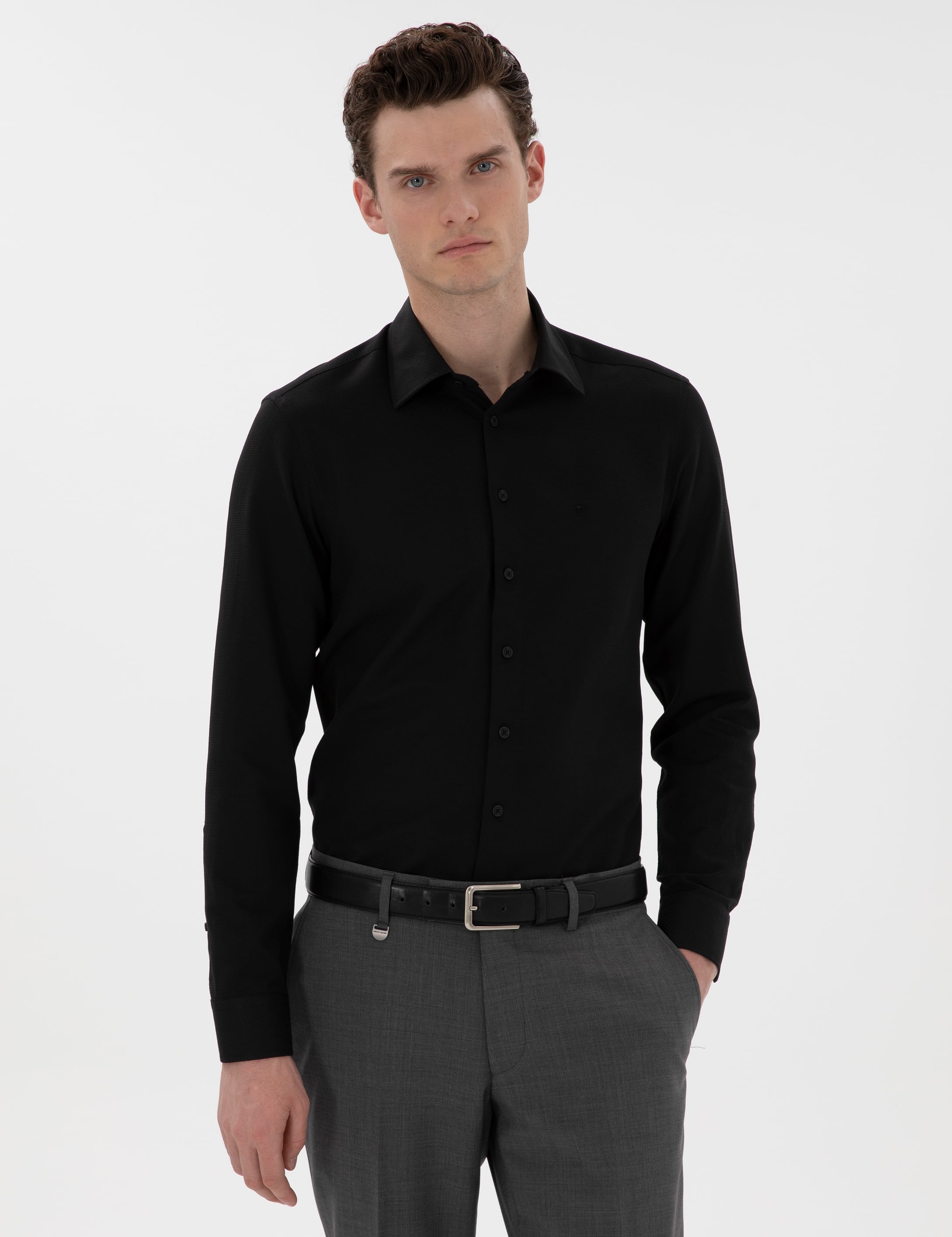 Siyah İtalyan Yaka Armürlü Uzun Kollu Gömlek