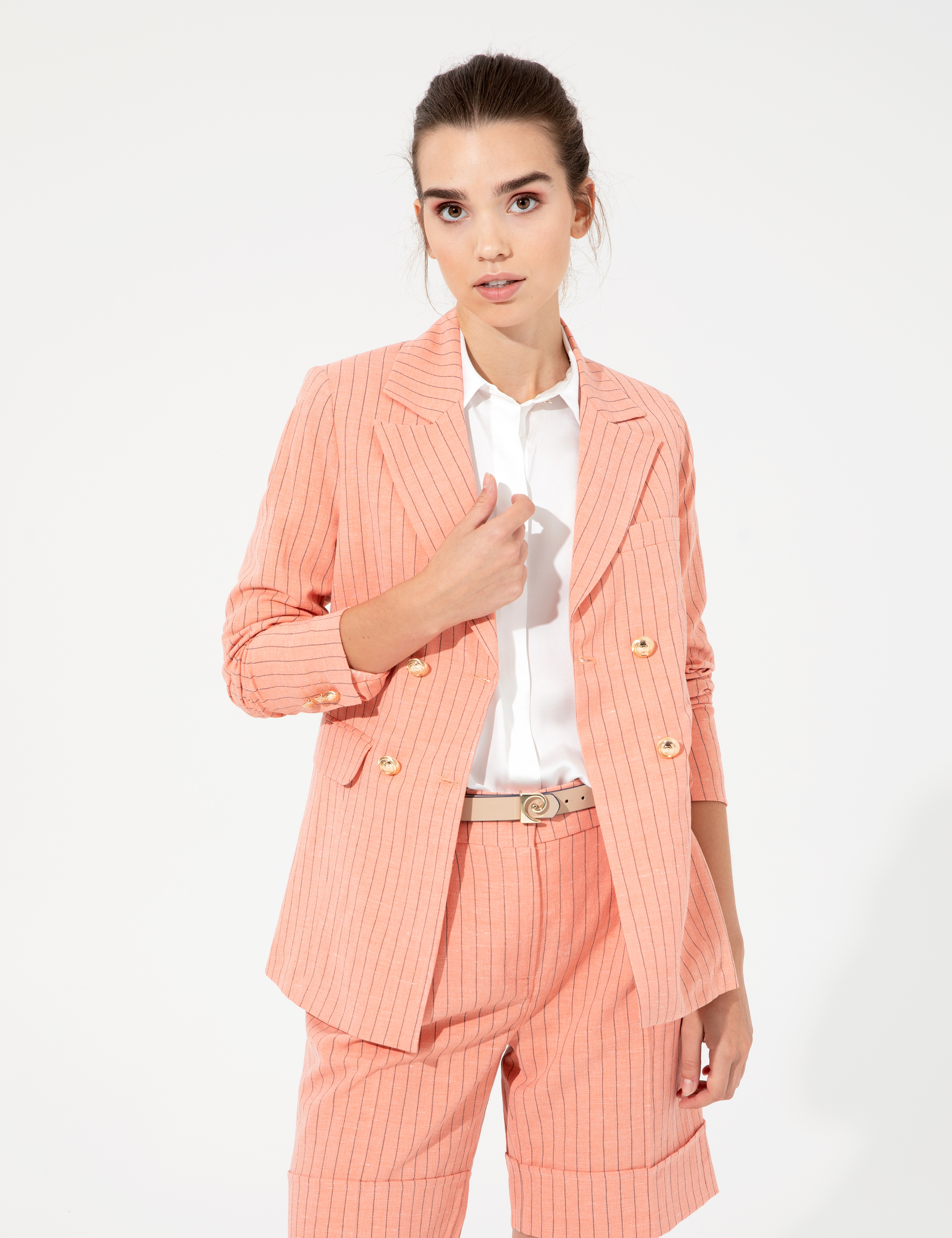 Turuncu Çizgili Keten Karışımlı Kruvaze Ceket