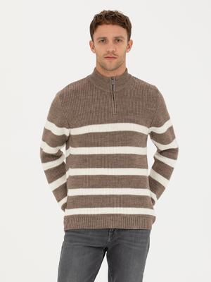 Vizon Melanj Slim Fit Fermuarlı Dik Yaka Triko Kazak