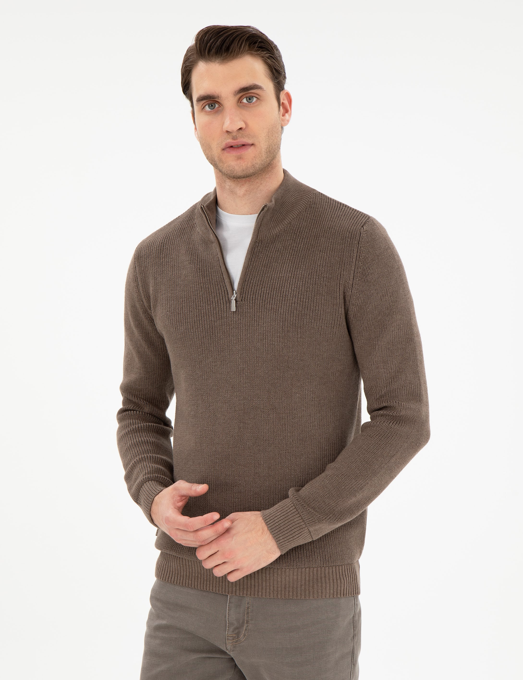 Vizon Melanj Slim Fit Fermuarlı Dik Yaka Triko Kazak
