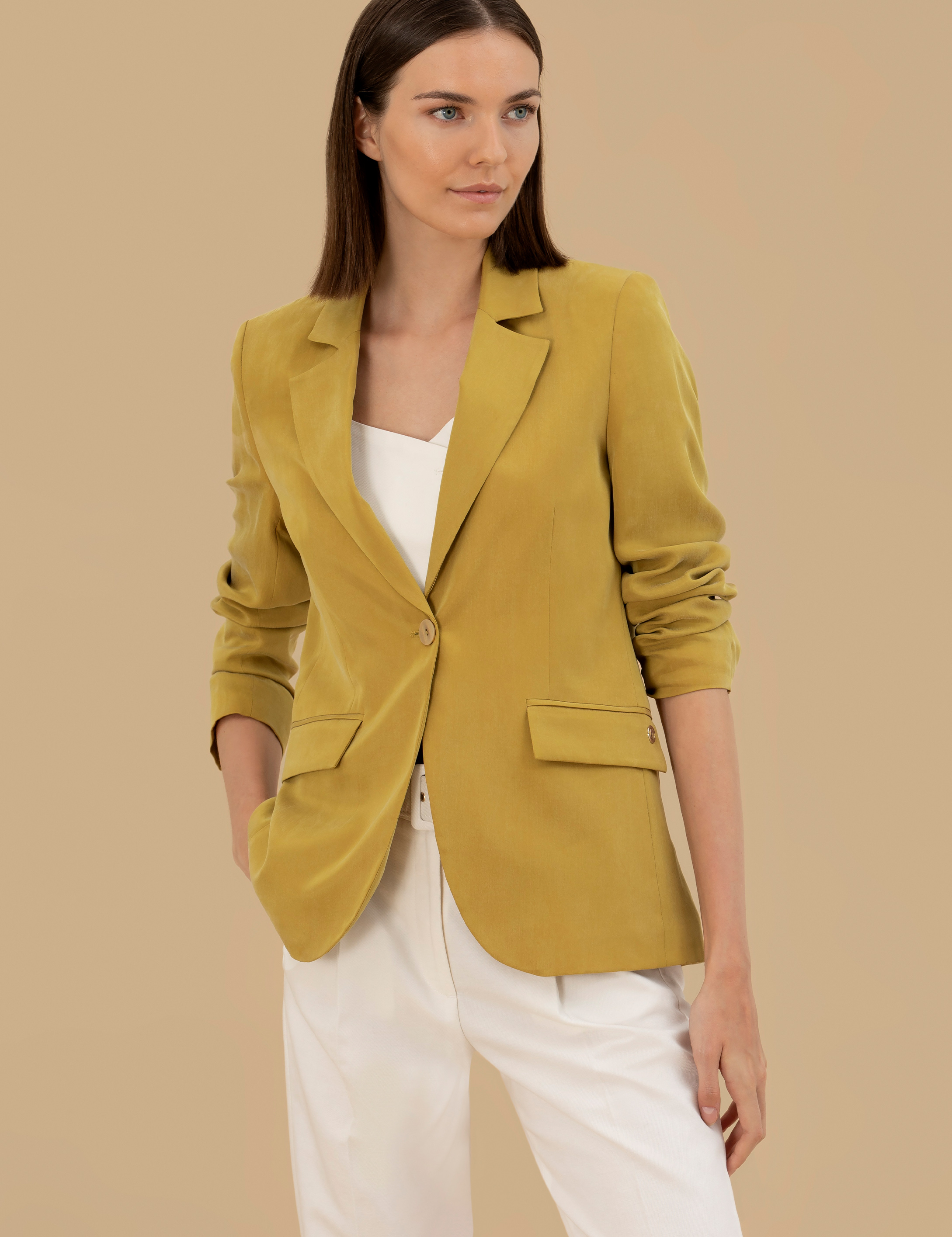 Kupro ceket hafif dokusu ve nefes alabilir özelliğiyle yaz ve ilkbahar ayları için ideal bir parçadır. Kumaşın doğal parlaklığı, ceketin şıklığını tamamlıyor ve tarzınıza klasik bir dokunuş katıyor. Tek düğme kapamalı tasarım, cekete minimal ve şık bir hava kazandırıyor. İki yan cep, hem estetik hem de işlevsel bir detay olarak dikkat çekiyor.